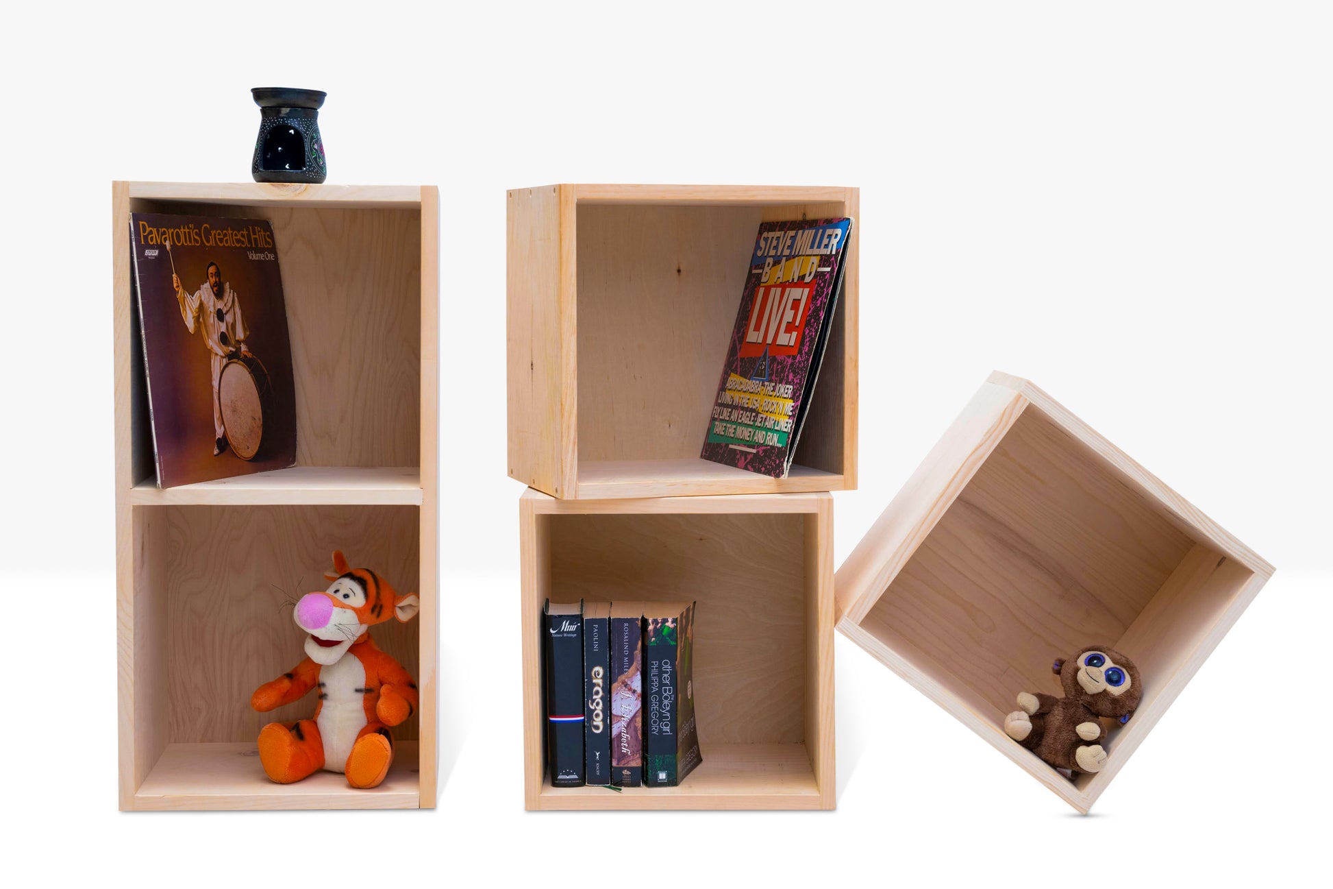 Evergreen cubes and double cubes are useful wherever flexible storage is needed. They are able to hold LPs, notebooks, over-sized books, cookbooks, baskets, dog toys etc. They are a fun and versatile way to organize any room. They are built from solid white pine. The cubes are 14-1/4" wide and 14-1/4" high. The double cubes are 14-1/4" wide 28-1/2" high. They are both 11-1/4" deep.